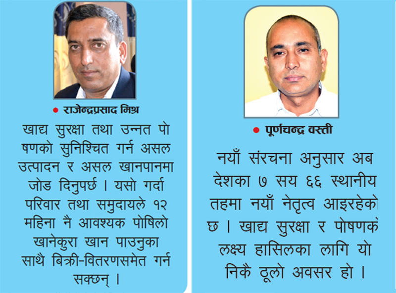 सरोकारवालाहरुले संघीय नेपालको नयाँ संरचनालाई कूपोषणको अन्त्यका अवसरका रुपमा लिएका छन्। ‘नयाँ संरचना अनुसार अब देशका ७ सय ६६ स्थानीय तहमा नयाँ नेतृत्व आइरहेको छ,’ गुण नियन्त्रण विभागका प्रवक्ता वस्तीले भने, ‘यो निकै ठूलो अवसर हो। स्थानीय तहमा चुनिएका सबै नेतृत्वले खाद्य सुरक्षा र पोषणलाई प्राथमिकतामा राखेर काम अगाडि बढाउँछन् भन्नेमा विश्वास छ।’