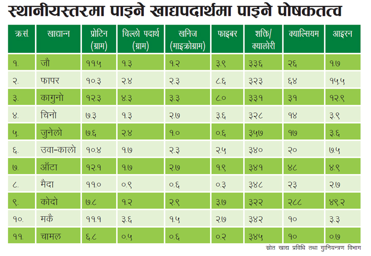खाद्य प्रविधि तथा गुण नियन्त्रण विभागका प्रवक्ता पूर्णचन्द्र वस्तीका अनुसार गाँउघरमा सहजै उत्पादन हुने स्थानीय खाद्यपदार्थको माध्यमबाटै असल पोषण प्राप्त गर्न सकिन्छ। ‘आफ्नै बारी तथा कान्लामा उपलब्ध स्रोतको उपयोग गरेर कूपोषणको दीगो समाधान गर्न सकिन्छ,’ उनले भने, ‘यसका लागि कृषि, शिक्षा, स्वास्थ्य, सडक लगायतका सम्पूर्ण सरकारी निकायको सहयोगमा आवश्यक काम अगाडि बढाउनुपर्छ।’ उनले कृषि उत्पादन र पशुपन्छी पालनलाई व्यापारसँगै पोषणसँग जोडेर कार्यक्रम बनाउनुपर्ने सुझाब दिए। यसका लागि करेसाबारीमा विभिन्न थरिका तरकारी रोप्ने, फलफूलका बोट रोप्ने गर्दा पनि असल खानपानमा ठूलो सहयोग पुग्ने उनको भनाइ छ।