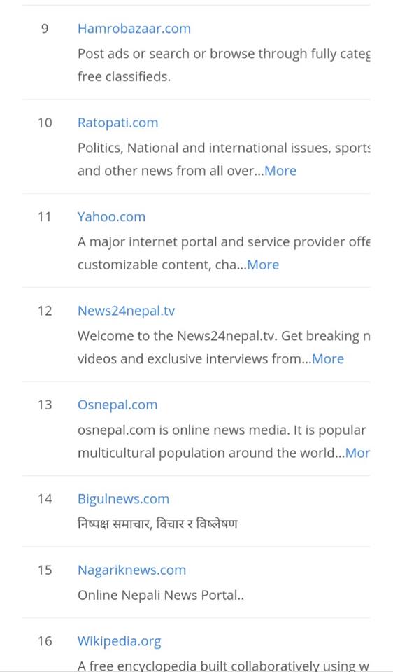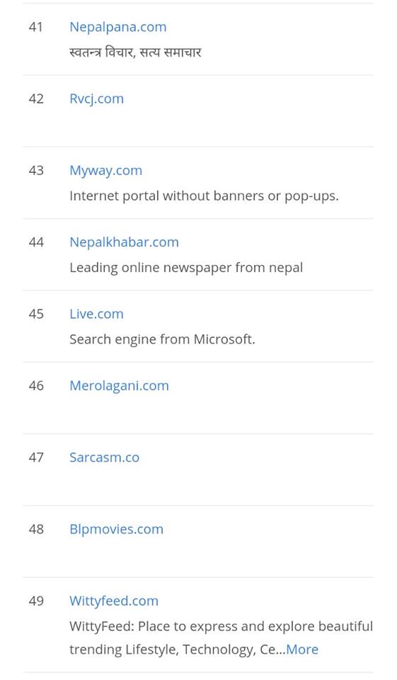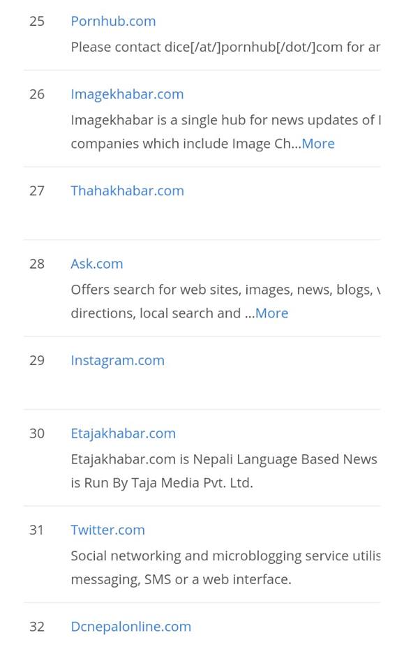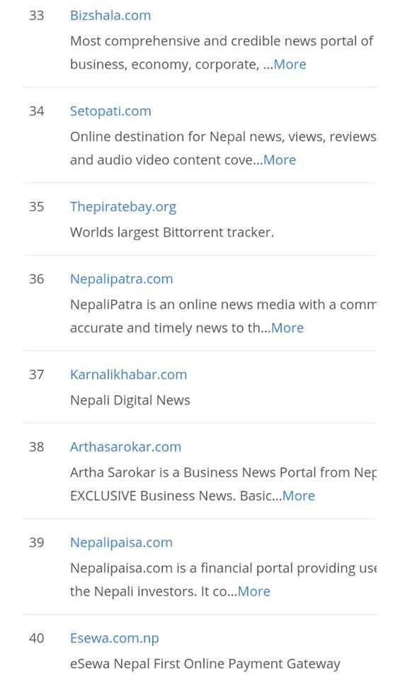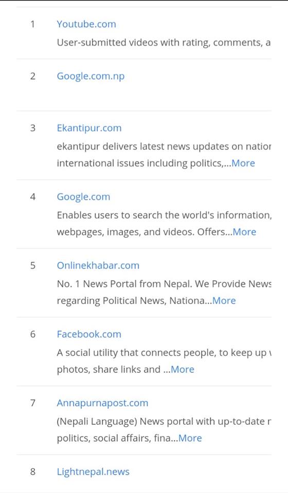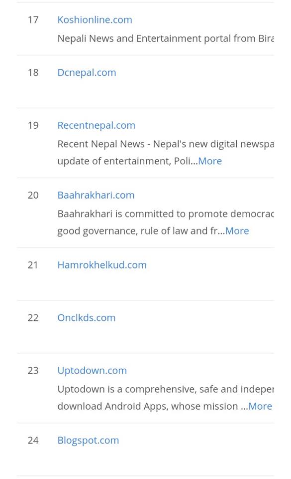तपाईले दैनिक रुपमा चलाउने वा सर्च गर्ने online news site नेपाल मा कुन कतीअाै स्थानमा रहेका छन यस बिषयमा हामिले यो रिपोर्ट तयार पार्द सम्म नेपालमा भने पहिलाे स्थानमा youtube रहेकाे छ भने अन्य टप ५० मा रहेका अनलाइन साइट हरु यस प्रकार रहेका छन् ...