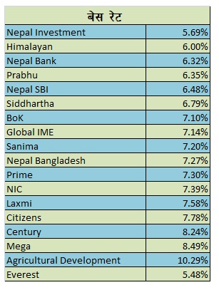 राष्ट्र बैंकले दिएको असोज अन्त्यसम्मको तथ्यांकमा भने औसतमा २८ वटै वाणिज्य बैंकको यो दर ६.४३ प्रतिशत मात्र रहेको थियो । महिना दिनमा नै कर्जाको आधार दर लगभग १ प्रतिशतले बढेको हो ।